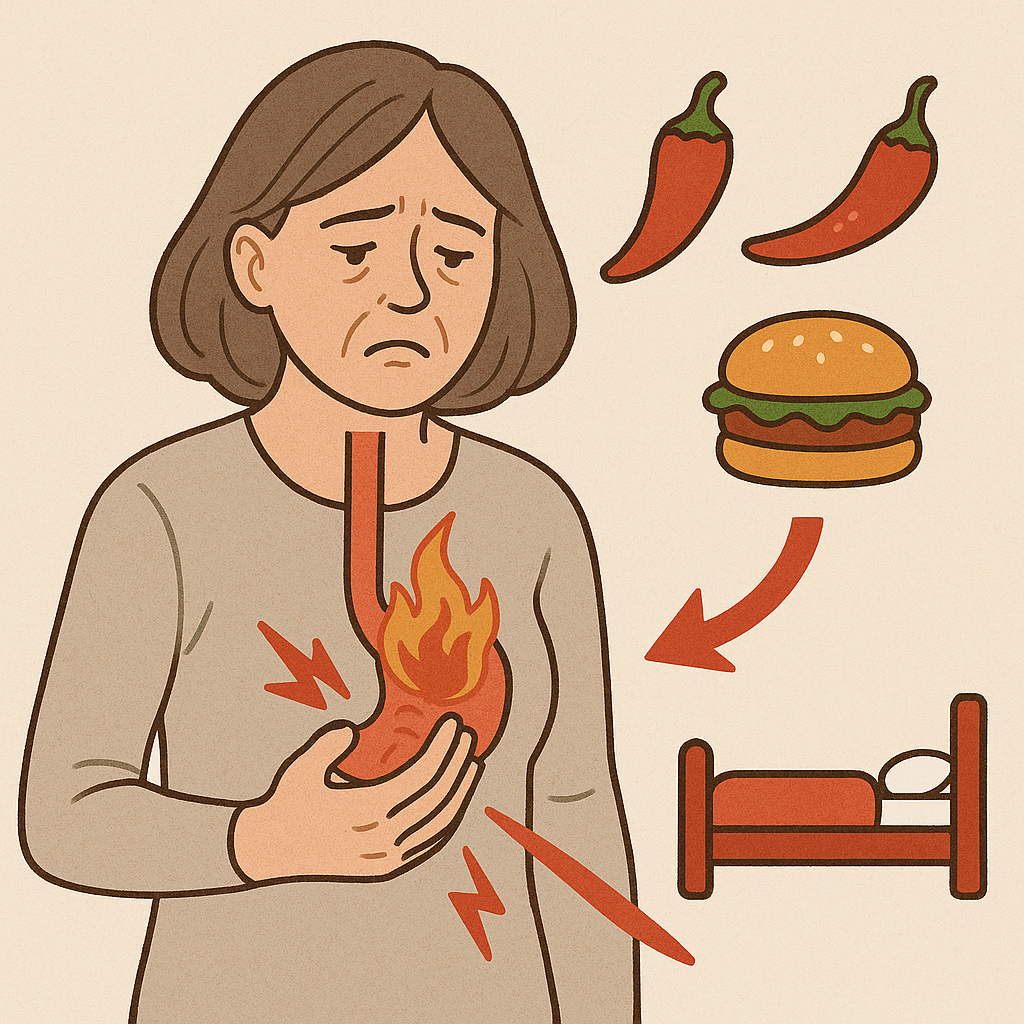 위산이 식도로 역류하여 가슴 중앙에 타는 듯한 통증을 유발합니다.