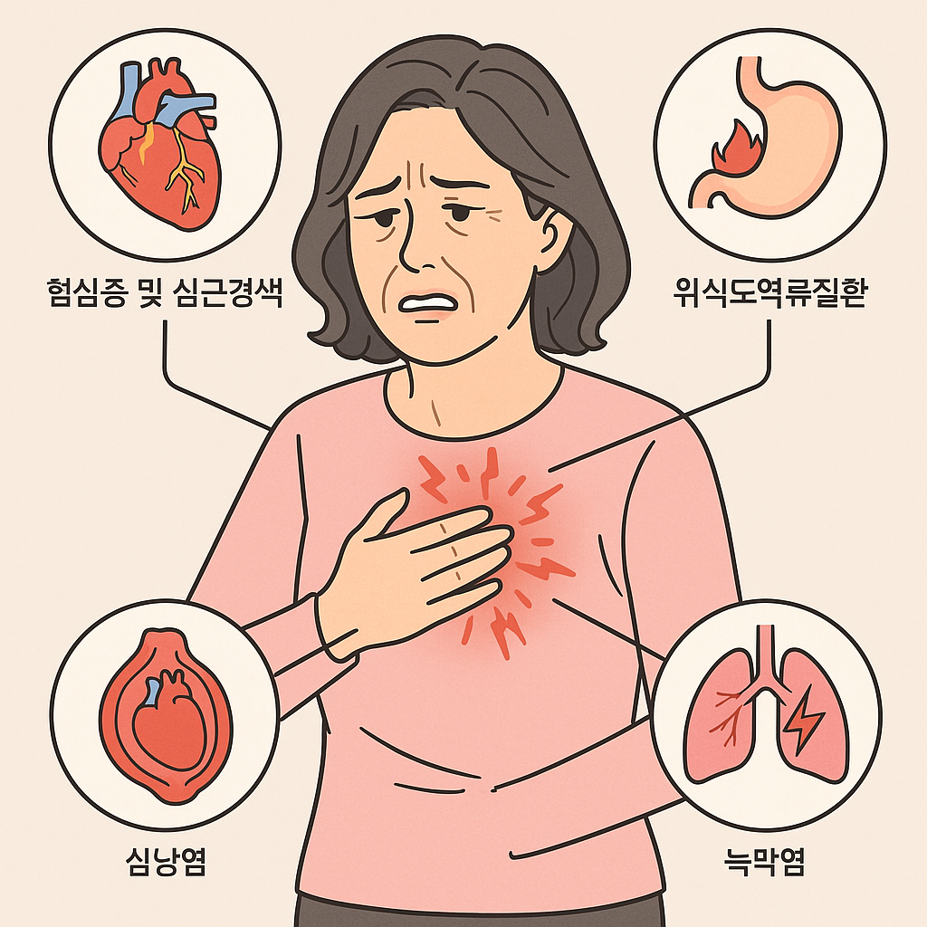 - 협심증: 심장 근육에 혈액이 일시적으로 부족할 때 발생하며 활동 시 통증이 생깁니다.