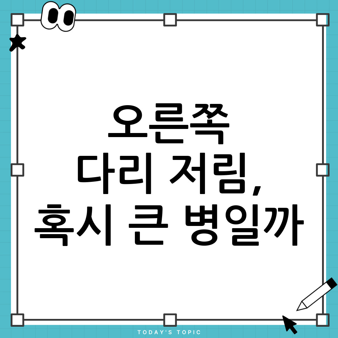 A1: 그렇지 않습니다. 대부분의 경우 일시적인 자세 문제나 혈액순환 장애로 인해 발생합니다. 하지만 증상이 지속되거나 다른 심각한 증상(통증, 근력 약화, 감각 이상 등)이 동반된다면 전문의의 진료를 받아야 합니다. 특히 오른쪽 다리가 저리는 증상이 반복된다면 그냥 지나치지 마세요.